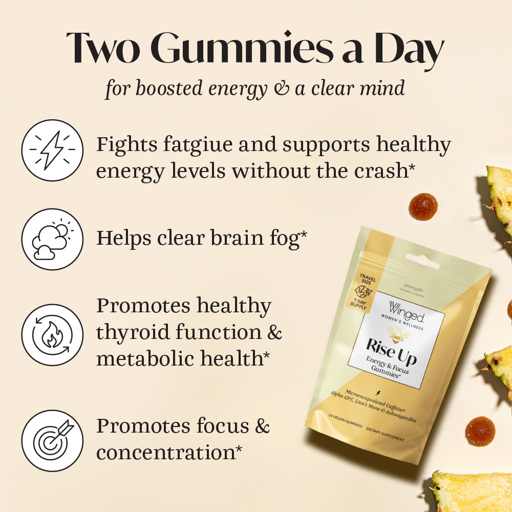 Used as a nootropic morning energizer, pick-me-up for the midday slump, pre-workout supplement, or study-aid. Rise Up Gummies are a tasty way to clear the brain fog, focus your mind, and get it all done.