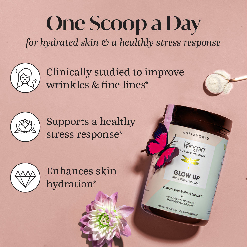 Glow Up promotes radiant, glowing skin, lustrous hair, and strong nails while also protecting against the damaging effects of the stress hormone cortisol, which leads to collagen breakdown. Glow up comes in an unflavored powder that mixes easily in any beverage, hot or cold.