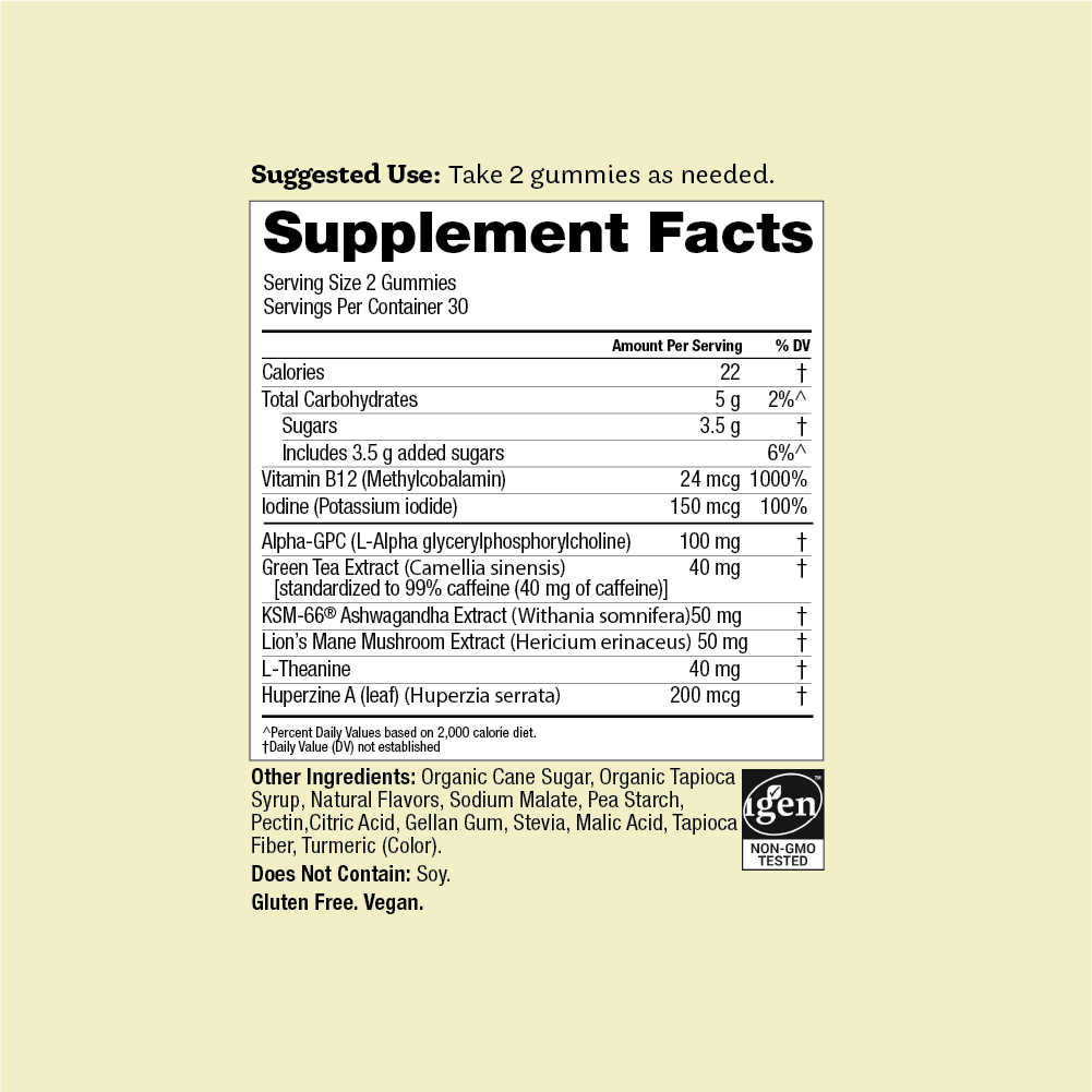 Ingredients: Alpha-GPC, Green Coffee Bean Extract (fruit), Ashwagandha Extract (standardized for 1.5% withanolides) Lion’s Mane Mushroom Extract (standardized for 30% polysaccharides) L-Theanine, Huperzine A, Vitamin B12 (Methylcobalamin), Iodine.