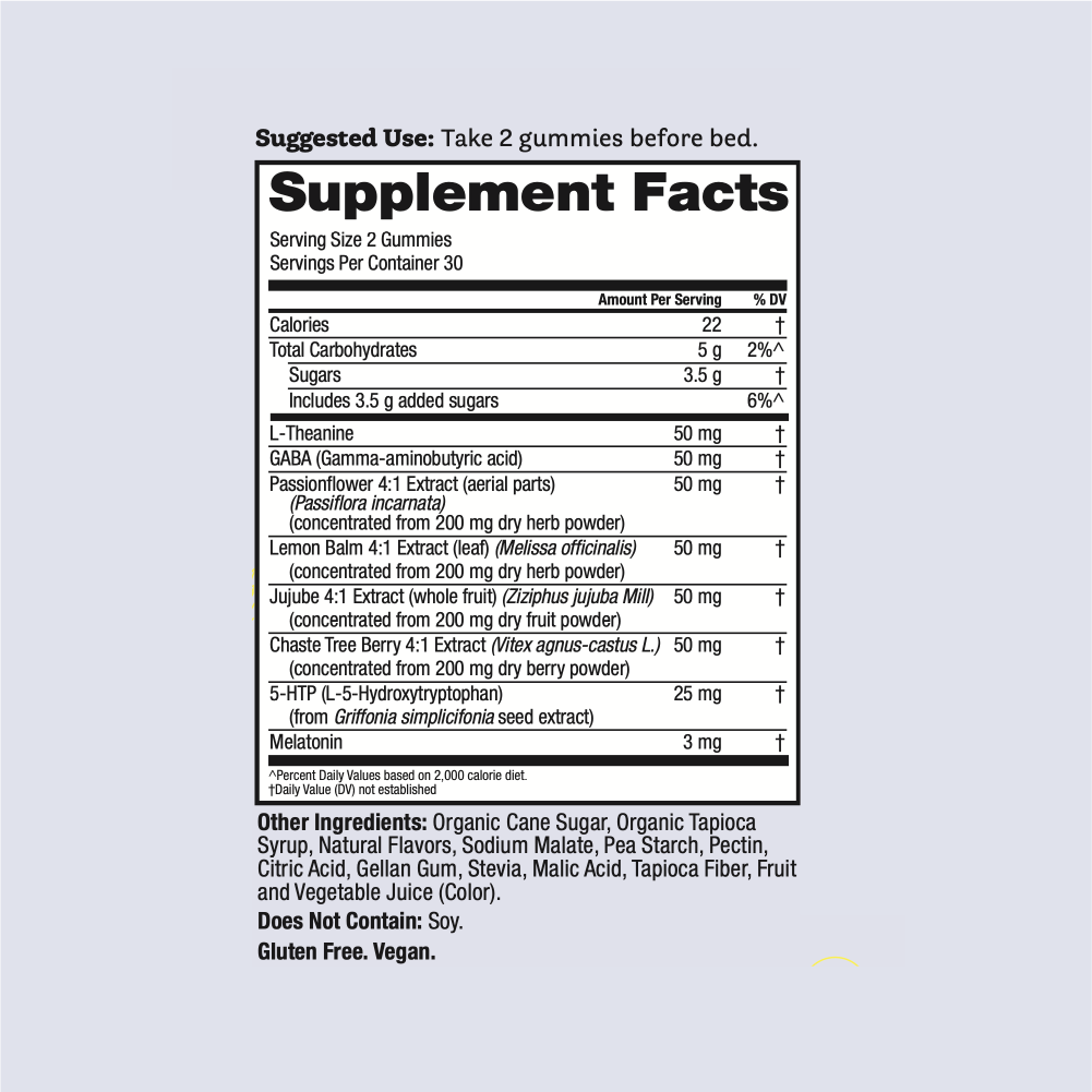 Ingredients: L-Theanine, GABA, Passionflower 10:1 Extract, Lemon Balm 4:1 Extract (leaf), Jujube 6:1 Extract, Chaste Tree Berry 2:1 Extract (Vitex), 5-HTP, Melatonin
